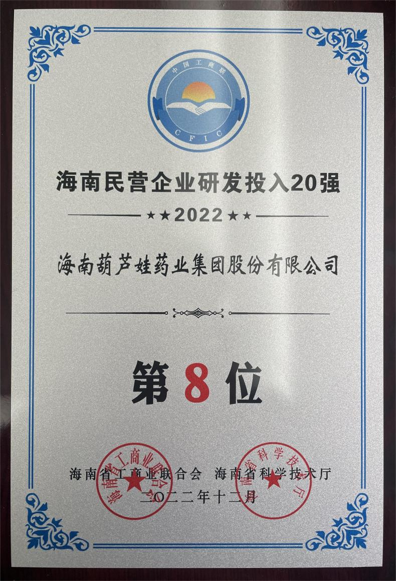 12月23日,2022海南民营企业50强和研发投入20强发布会在海口举行。会上发布了“2022海南民营企业50强”“2022海南民营企业研发投入20强”榜单和分析报告。德扑之星药业再次荣登两榜,在海南民营企业50强榜单中位列第25位,较去年上升8位,这也是公司连续三年登榜;在海南民营企业研发投入20强中位列第8位,较去年上升7位。